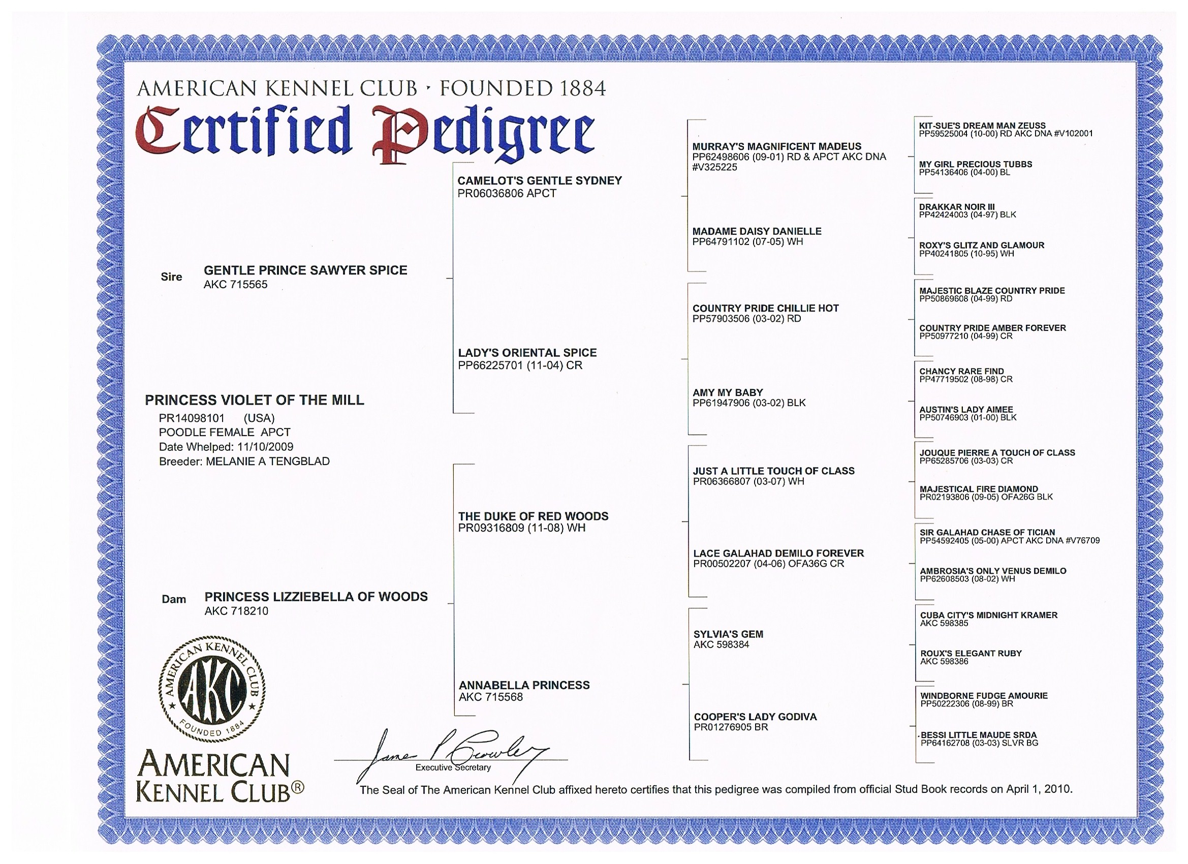 Dinah is our pick of litter from the 3rd generation of our own breeding from our Zoe -- eager-to-please, highly trainable, devoted -- line. Dinah chose me the first day she was born; she was the first born in the litter and would crawl to me instead of her mama, London. She has been the most affectionate puppy we've ever had. Everyone in our family adores her.